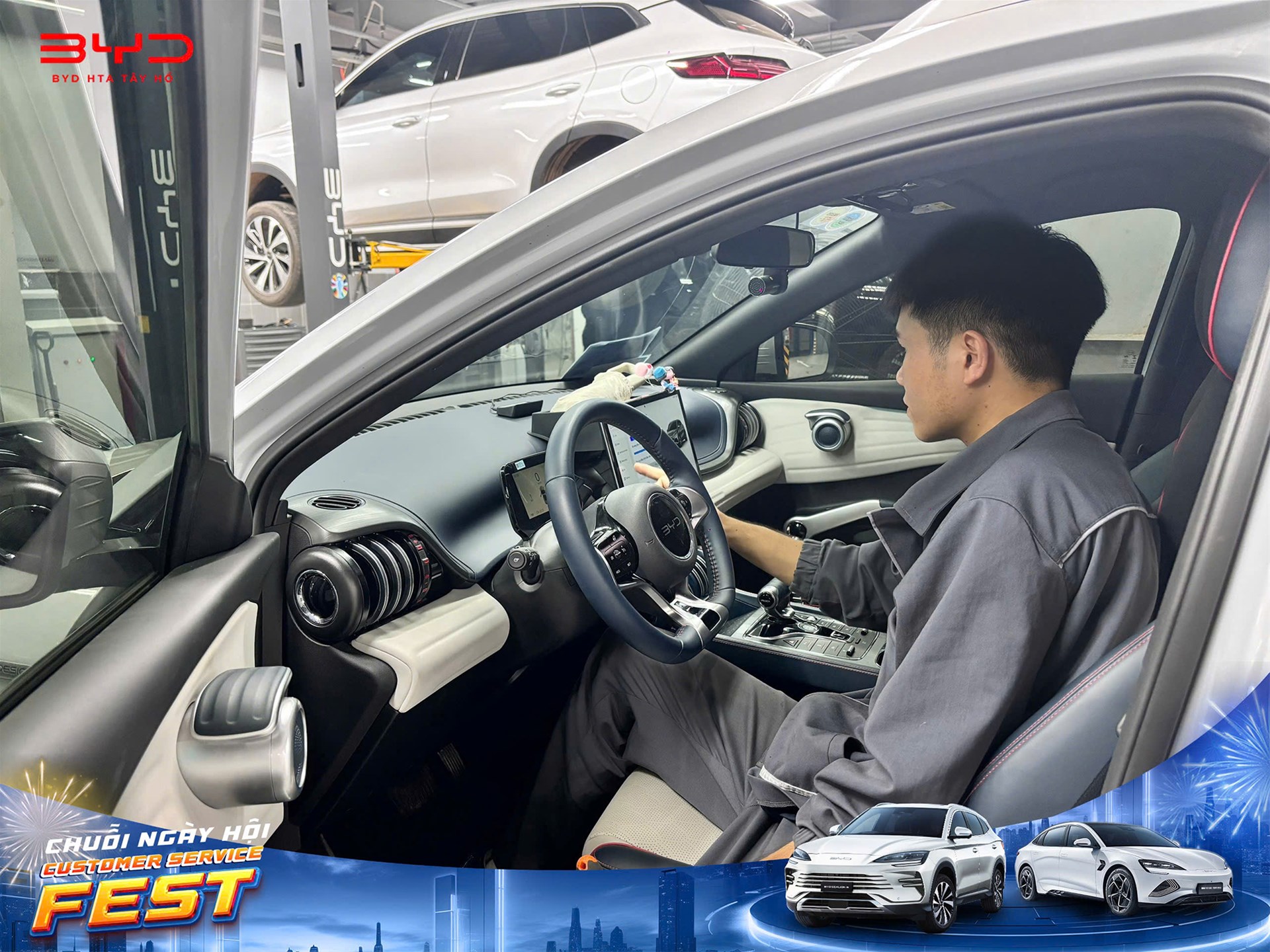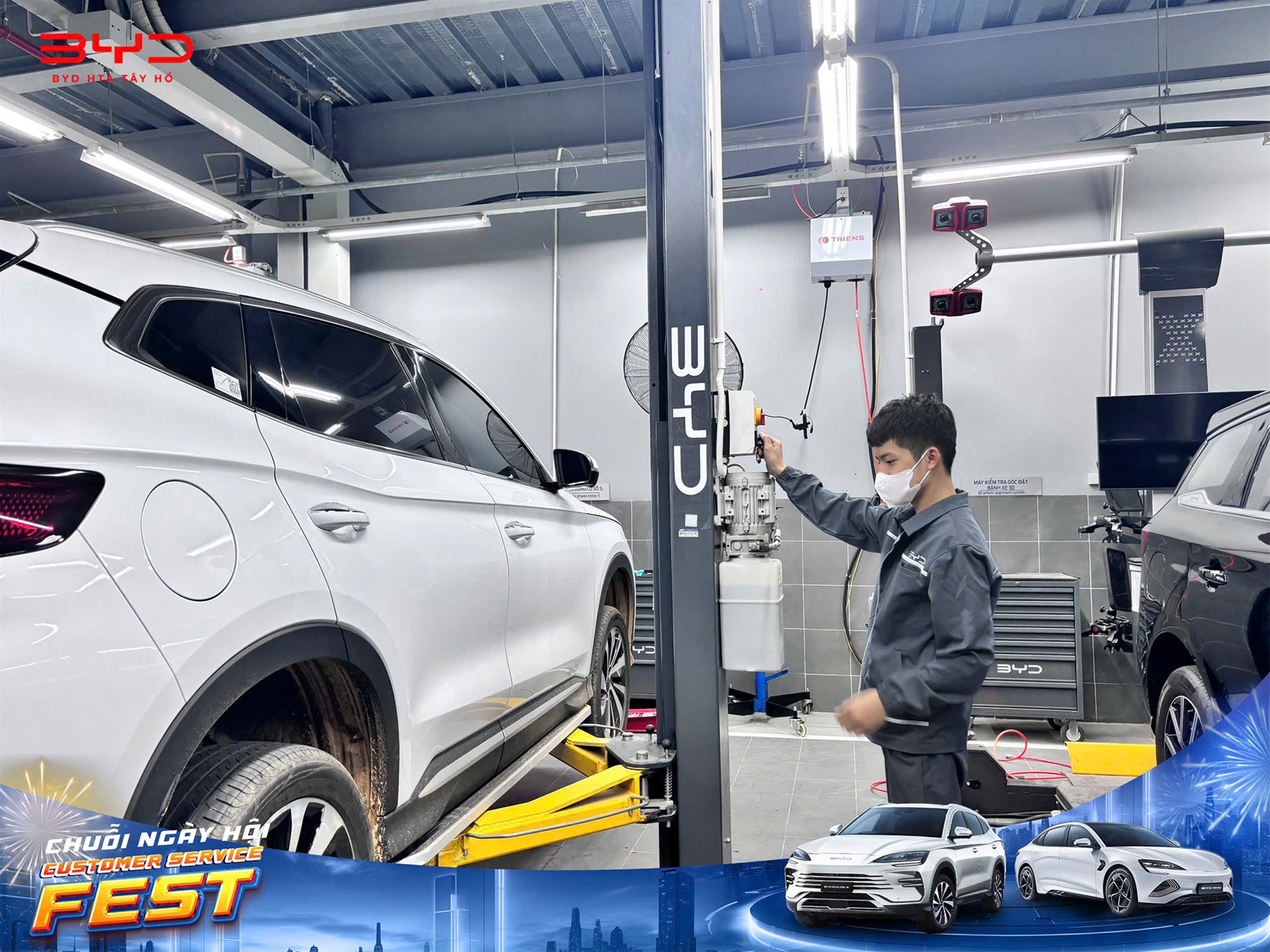 - Chăm sóc và kiểm tra xe toàn diện: Dịch vụ kỹ thuật hậu mãi chuyên sâu từ đội ngũ kỹ sư BYD được đào tạo chuyên nghiệp theo tiêu chuẩn toàn cầu, giúp khách hàng yên tâm vận hành và tối ưu độ bền của phương tiện.