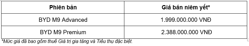 BYD M9 mới được phân phối tại thị trường Việt Nam với 2 phiên bản Advanced và Premium, đi kèm là 4 tùy chọn màu sắc ngoại thất và 2 tùy chọn màu sắc nội thất. BYD Việt Nam đặc biệt tặng bộ quà tặng đi kèm cho tất cả các khách hàng sở hữu một trong các phiên bản của mẫu xe BYD M9 mới bao gồm: một thiết bị sạc cầm tay và một thiết bị chuyển đổi nguồn điện (V2L). Giá bán chi tiết như sau: