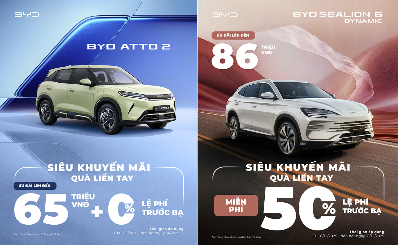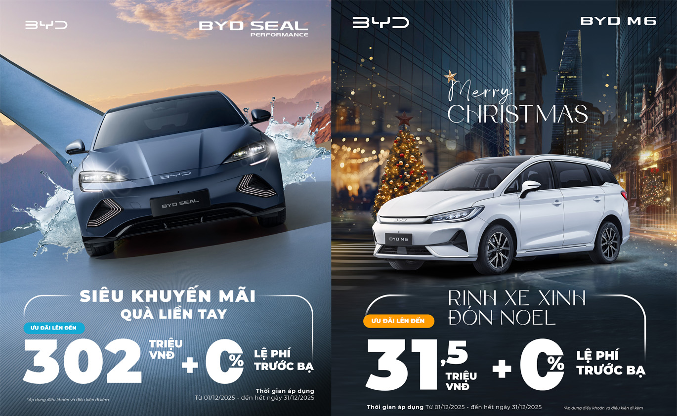 – BYD Việt Nam chính thức công bố chương trình ưu đãi đặc biệt tháng 12 mang tên “Rinh Xe Xịn – Đón Noel”, dành cho khách hàng mua xe mới BYD trong thời gian từ 01 tháng 12 đến hết ngày 31 tháng 12 năm 2025 trên toàn hệ thống đại lý ủy quyền.