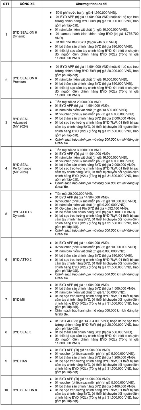 Bên cạnh những ưu đãi từ BYD Việt Nam, khách hàng khi mua tất cả dòng xe được BYD Việt Nam phân phối sẽ nhận được ưu đãi vay đến 90% (JACCS) hoặc 85% (VPBank), lãi suất vay chỉ từ 7,3%/năm trong vòng 03 năm đầu (Shinhan Bank). Đặc biệt, các dòng xe BYD ATTO 2, BYD ATTO 3, BYD M6 và BYD SEAL còn được áp dụng thêm chính sách hợp tác giữa BYD và Grab/ Be, nâng thời gian bảo hành pin lên mức 500.000 km hoặc 8 năm (tùy điều kiện nào đến trước).