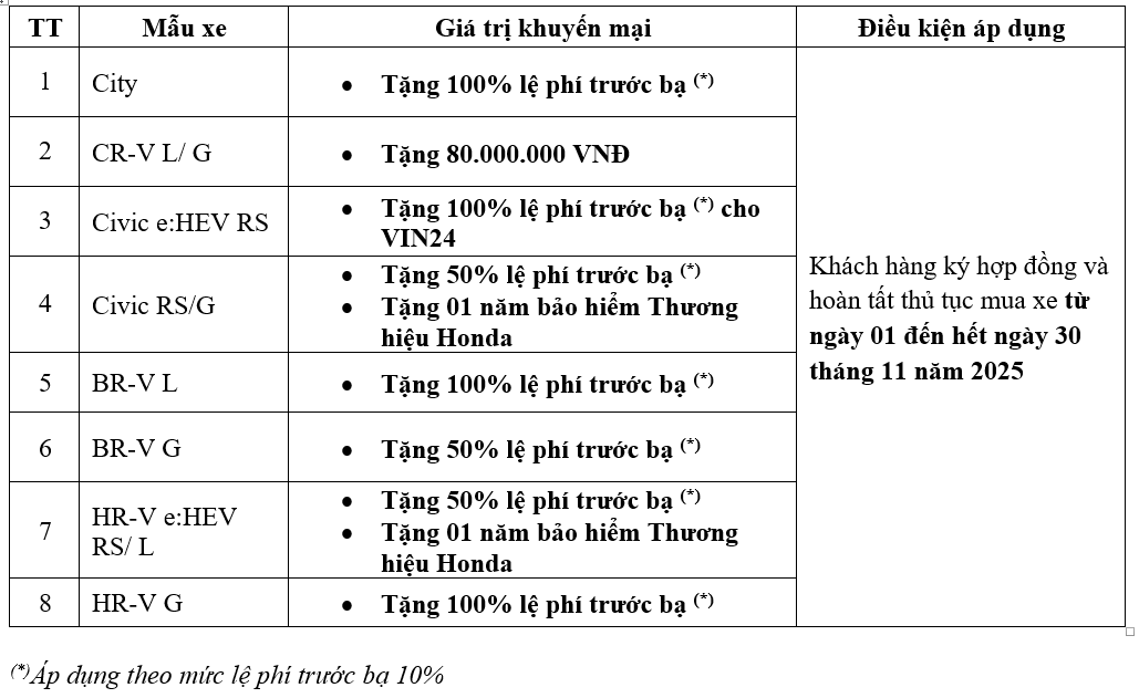 Đồng thời Honda Việt Nam cũng phối hợp cùng hệ thống Nhà Phân phối triển khai tháng tri ân với khuyến mại cực lớn dành cho các mẫu xe ô tô Honda theo danh sách dưới đây, chương trình khuyến mại diễn ra từ ngày 01 tháng 11 năm 2025 đến hết ngày 30 tháng 11 năm 2025 cụ thể như sau: