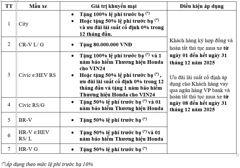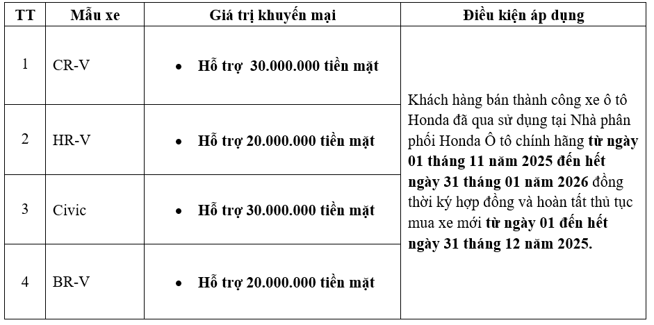 Honda Việt Nam đã triển khai Chương trình “Hỗ trợ siêu hời – Lên đời xế mới” và chương trình tháng tri ân với khuyến mại cực lớn dành cho các mẫu xe ô tô Honda theo danh sách dưới đây, chương trình khuyến mại diễn ra từ ngày 01 tháng 12 năm 2025 đến hết ngày 31 tháng 12 năm 2025.