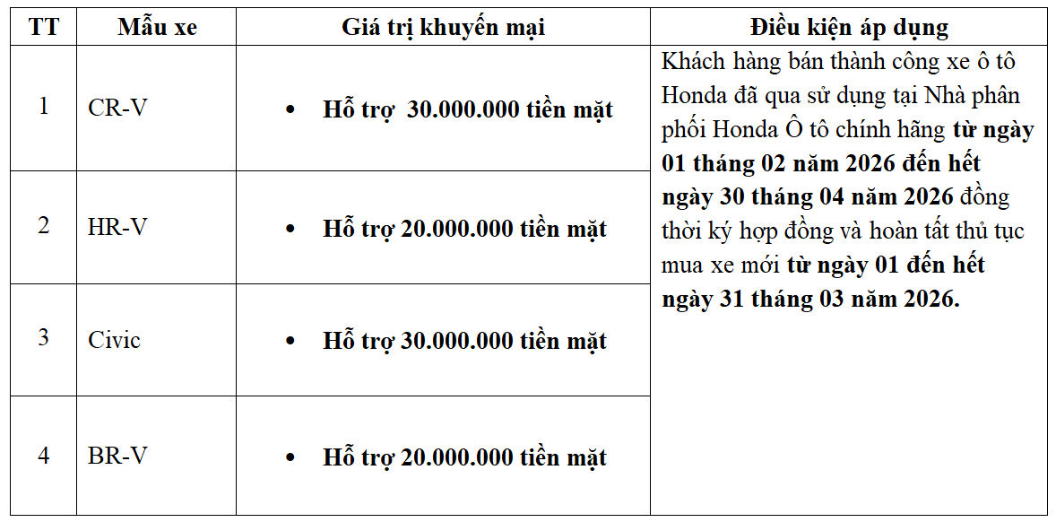 Ngoài ra song song với chương trình hỗ trợ đổi xe chính hãng “ Hỗ trợ siêu hời – Lên đời xế mới” trong tháng 03/2026, thì Honda Việt Nam cũng triển khai chương trình khuyến mại khi mua các dòng xe Ô tô Honda như sau: