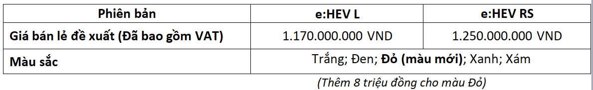 Ra mắt vào ngày 02/02/2026, Honda CR-V e:HEV mới được lắp ráp tại nhà máy Phú Thọ và chính thức bán tại thị trường Việt Nam từ ngày 11 tháng 02 năm 2026 qua hệ thống các Nhà Phân phối Ôtô Honda trên toàn quốc bao gồm các phiên bản cùng lựa chọn màu sắc và mức giá bán lẻ đề xuất như sau: