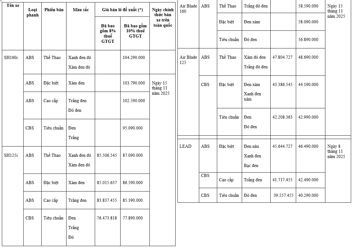 Từ tháng 11 này, SH160i/125i, Air Blade 160/125 và LEAD ABS 2026 sẽ chính thức được bán ra thị trường thông qua Hệ thống Cửa hàng Bán xe và Dịch vụ do Honda Ủy nhiệm (HEAD) trên toàn quốc với giá bán lẻ đề xuất như sau: