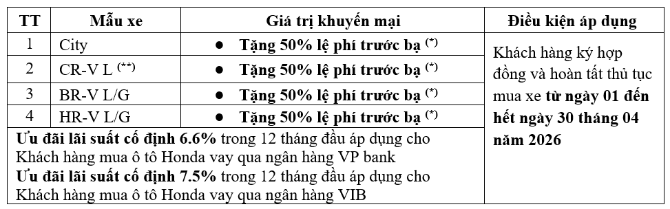 Cụ thể chương trình khuyễn mãi của Honda Việt Nam trong tháng 04/2026 như sau: