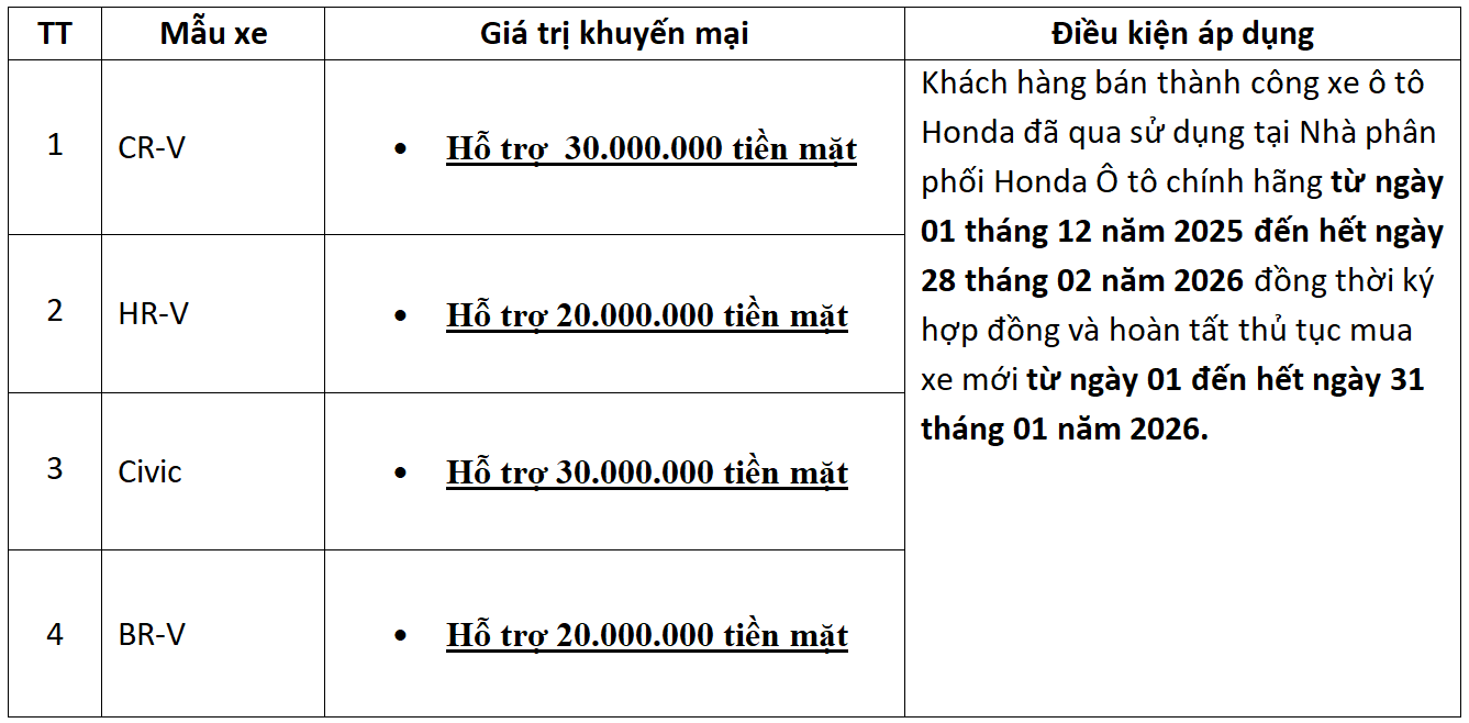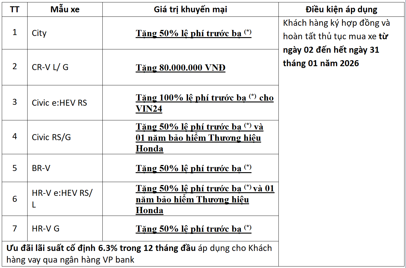 Ngoài ra Honda Việt Nam (HVN) phối hợp cùng hệ thống Nhà Phân phối triển khai tháng tri ân với khuyến mại cực lớn dành cho các mẫu xe ô tô Honda theo danh sách dưới đây, chương trình khuyến mại diễn ra từ ngày 02 tháng 01 năm 2026 đến hết ngày 31 tháng 01 năm 2026, cụ thể chương trình như sau: