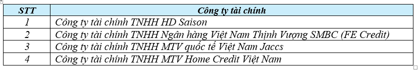 Danh sách các công ty tài chính áp dụng trong CTKM: