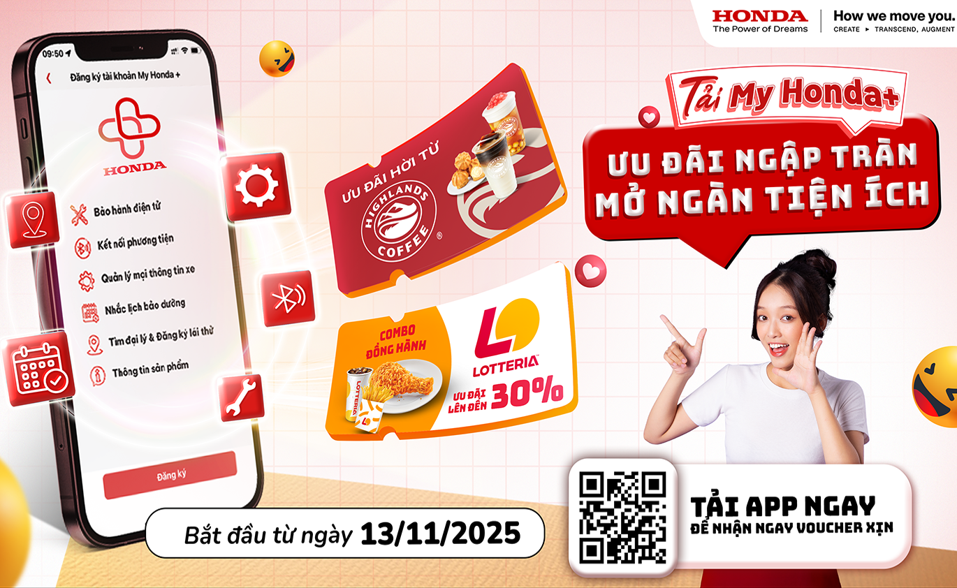 Ra mắt từ năm 2019, My Honda+ đã trở thành người bạn đồng hành tin cậy của hàng triệu khách hàng, giúp người dùng quản lý phương tiện dễ dàng và kết nối trọn vẹn với các dịch vụ của Honda. Nhằm tri ân sự đồng hành của khách hàng và khuyến khích trải nghiệm thêm các tiện ích kỹ thuật số, HVN triển khai chương trình ưu đãi “Tải My Honda+ Ưu đãi ngập tràn – Mở ngàn tiện ích”, mang đến nhiều quyền lợi hấp dẫn dành riêng cho người dùng ứng dụng, với sự hợp tác của các đối tác uy tín như Lotteria và Highlands Coffee.