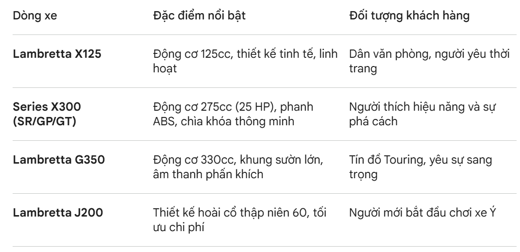 Điểm chung của các dòng Lambretta thế hệ mới chính là sự kết hợp nhuần nhuyễn giữa thủ công và công nghệ. Toàn bộ xe đều sở hữu khung thép liền khối cứng cáp, hệ thống đèn LED toàn phần, chìa khóa thông minh (Smartkey) và đặc biệt là hệ thống phun xăng điện tử từ Bosch, đảm bảo khả năng vận hành ổn định và tiết kiệm nhiên liệu.