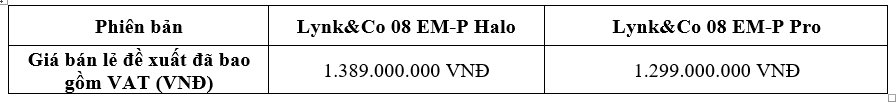 Mức giá bán lẻ đề xuất đã bao gồm VAT cho Lynk & Co 08 EM-P như sau: