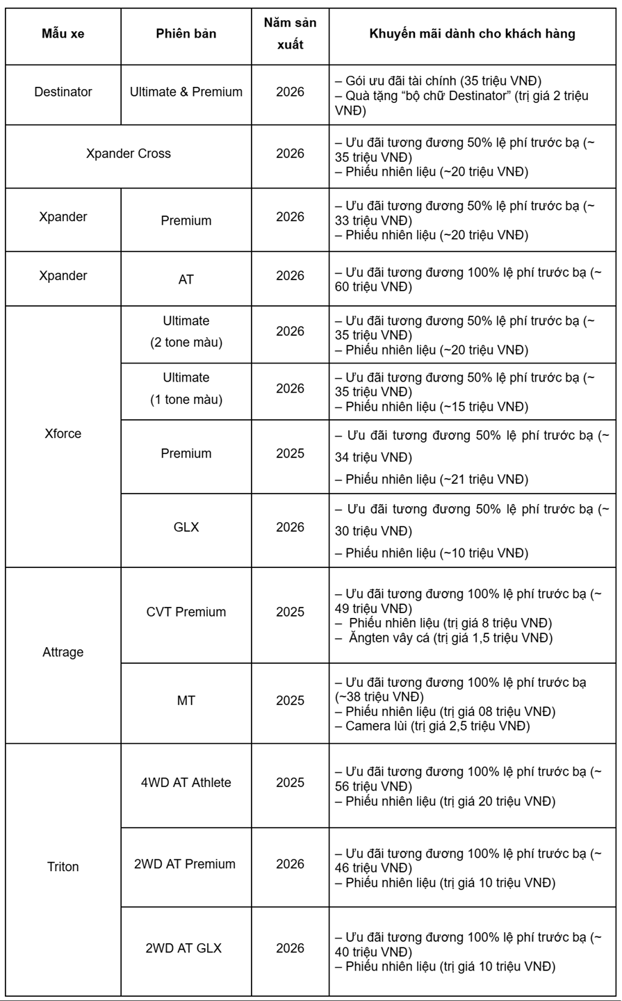 Trong dịp Tết Nguyên Đán 2026, Mitsubishi Motors Việt Nam đồng loạt triển khai loạt ưu đãi đặc biệt, áp dụng từ ngày 01/02 đến hết 28/02/2026. Gồm hỗ trợ lên đến 100% lệ phí trước bạ (LPTB), cùng nhiều quà tặng thiết thực.