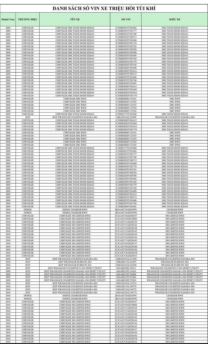 JVA Việt Nam, thông báo về việc hỗ trợ chương trình triệu hồi an toàn liên quan đến hệ thống túi khí trên một số xe ô tô đời cũ sản xuất từ 2008 đến 2010 thuộc các thương hiệu Jeep, RAM, Dodge và Chrysler.
